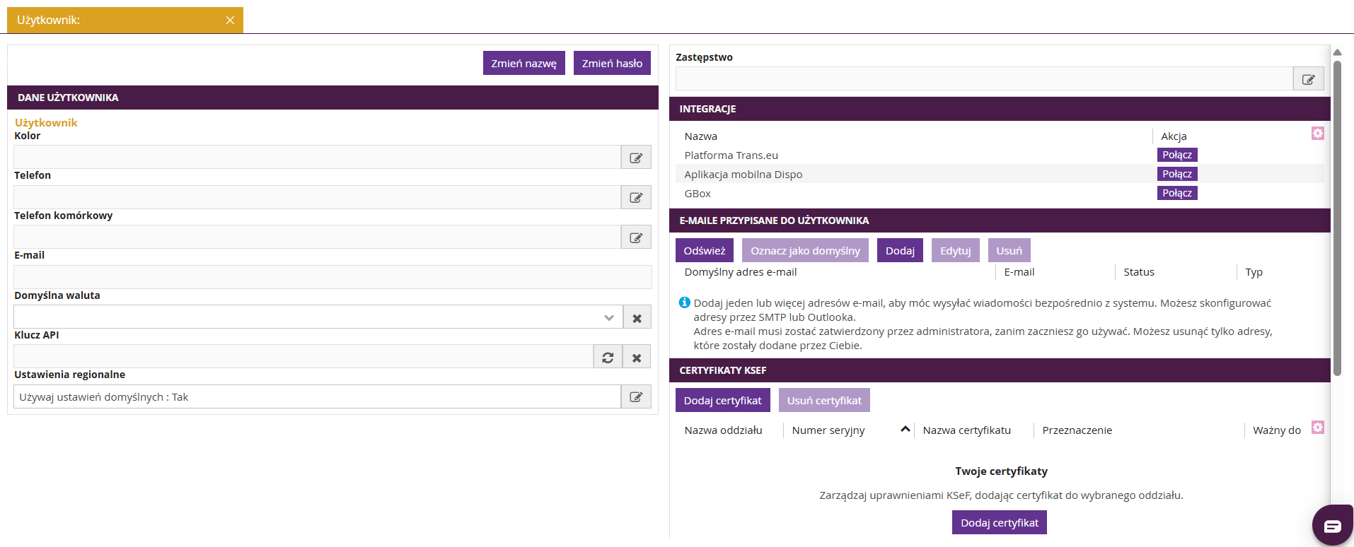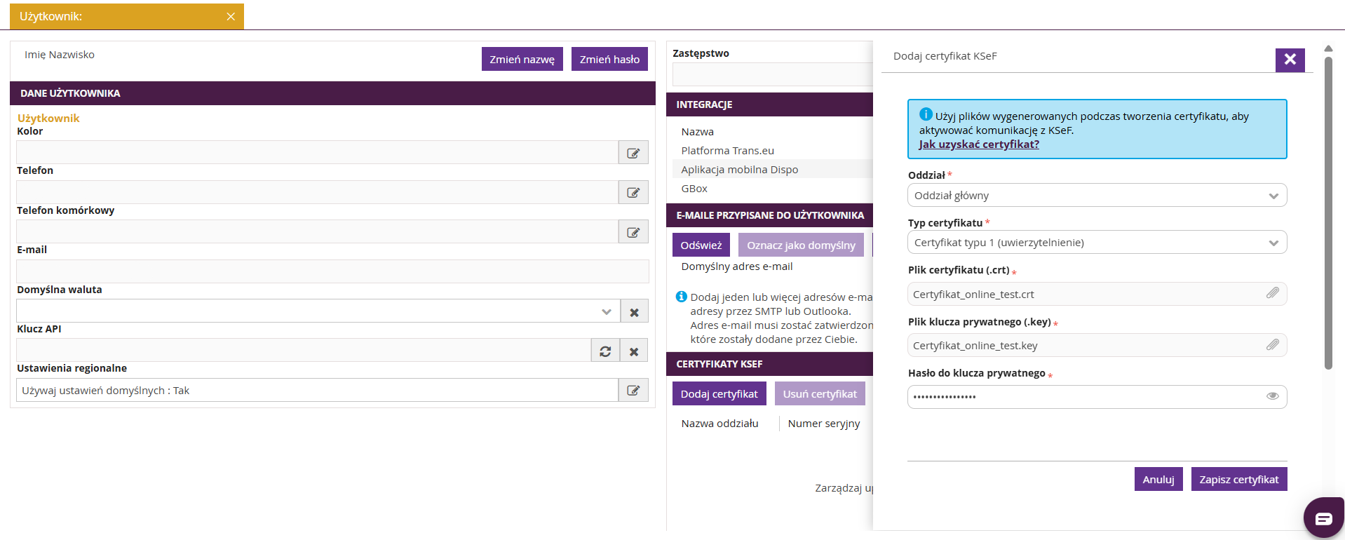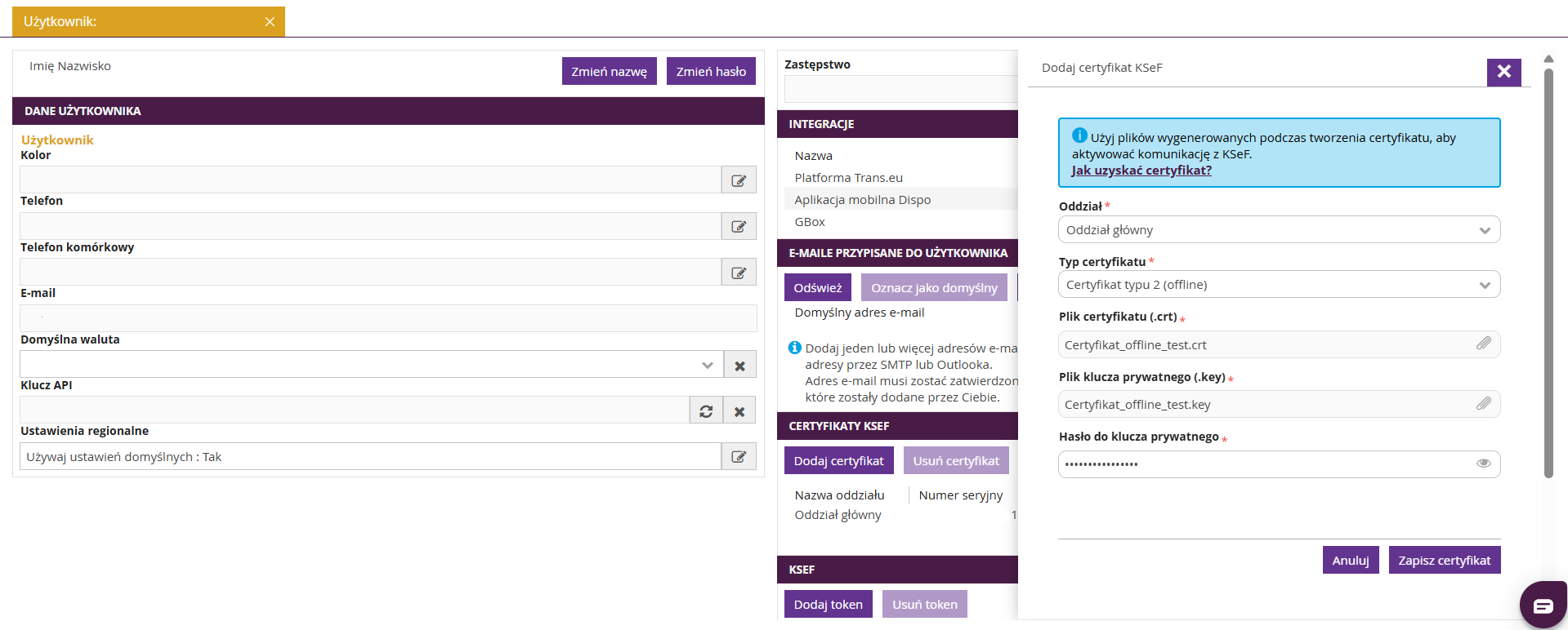 Aby możliwe było dodanie certyfikatów KSeF w systemie fireTMS, integracja z Krajowym Systemem e-Faktur musi być wcześniej włączona.