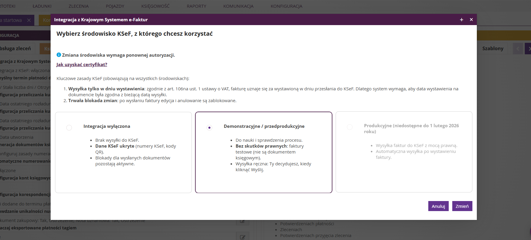 Uwaga: Zmiana środowiska KSeF w systemie powoduje konieczność ponownej autoryzacji - dodania certyfikatów online oraz offline.