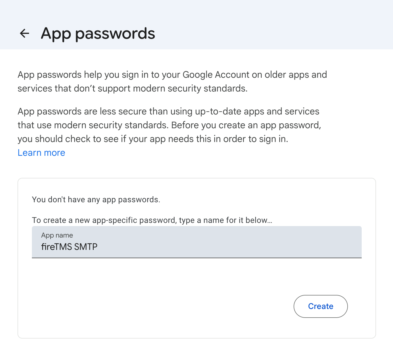 • Podaj nazwę aplikacji (np. fireTMS SMTP) i wygeneruj hasło.
