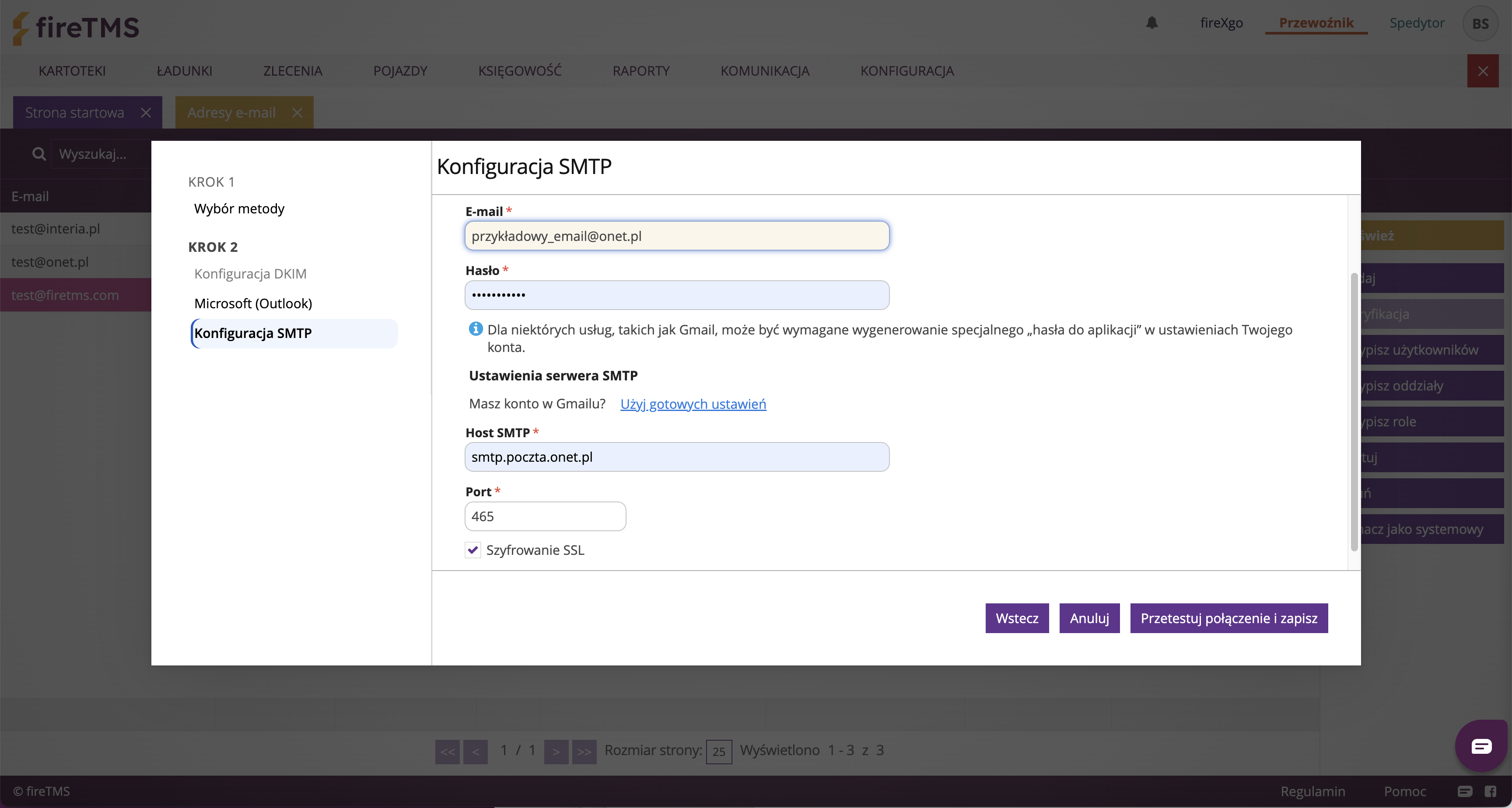 Konfiguracja SMTP dla popularnych dostawców poczty w fireTMS