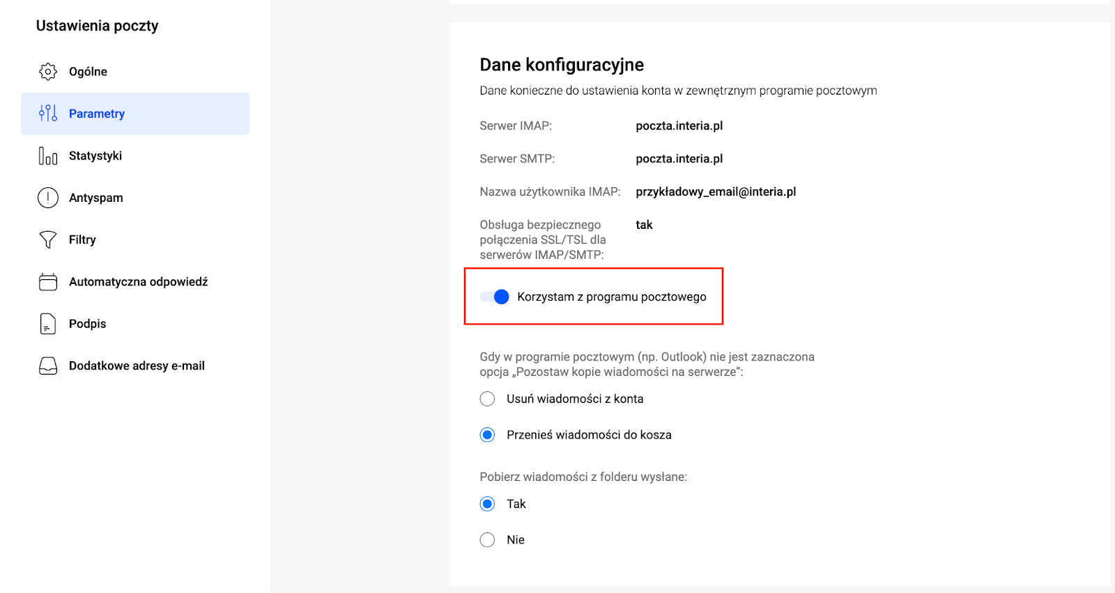 W celu poprawnej konfiguracji skrzynki Interia należy najpierw włączyć obsługę programów pocztowych w ustawieniach konta.