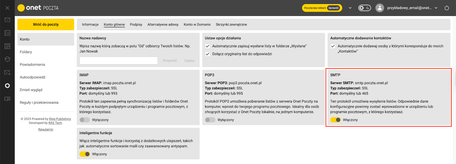 Przed konfiguracją skrzynki należy upewnić się, że obsługa SMTP jest aktywna w ustawieniach konta.